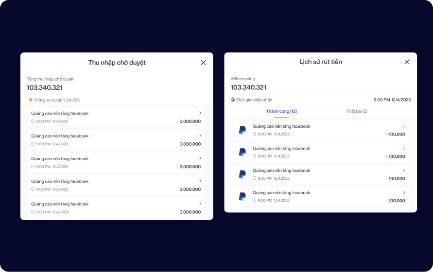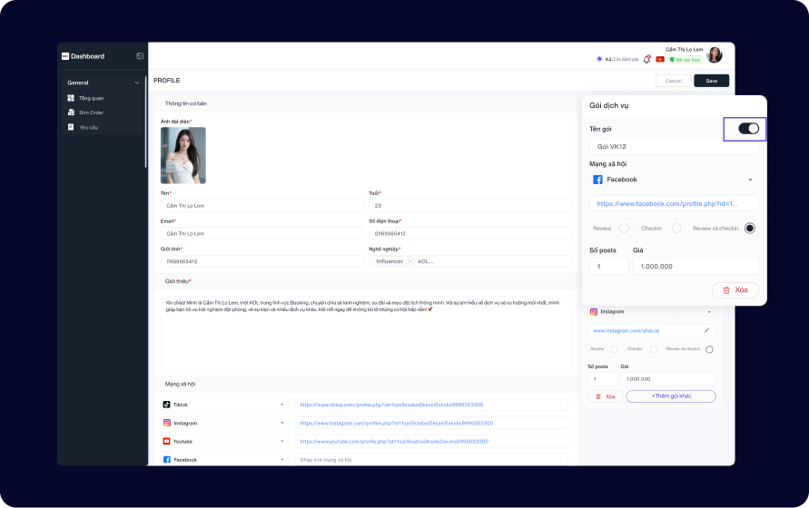 Khoản thu nhập thực tế được thanh toán minh bạch, đúng hạn. Hệ thống báo cáo chi tiết giúp KOL dễ dàng theo dõi và quản lý doanh thu.