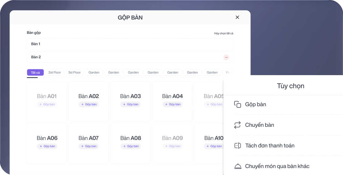 Tùy chọn chia bill, gộp bàn, chuyển bàn linh hoạt